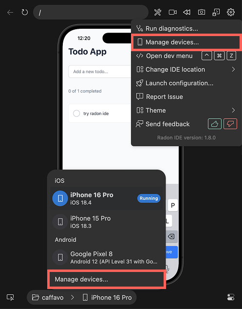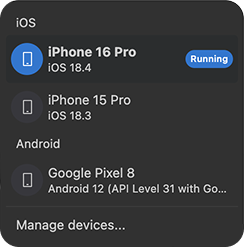 Radon IDE manages its own instances of Android emulators and iOS simulators separately from the ones you normally create with Xcode or Android Studio. Thanks to this architecture, you can easily add, update and remove devices you no longer need directly from the Radon IDE panel.